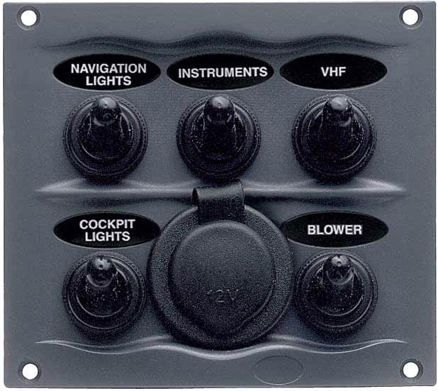 Sprutsikkert bryterpanel med vippebrytere. Meget høy kvalitet fra BEP. Sikringer på baksiden. IP=56. 5 brytere + 12V el.uttak.