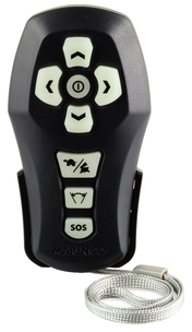 Håndholdt fjernkontroll til 1008093/94 Lyskaster Marinco. Silikonknapper som lyser i mørket. Fjernkontrollen rekker hele 65 meter.