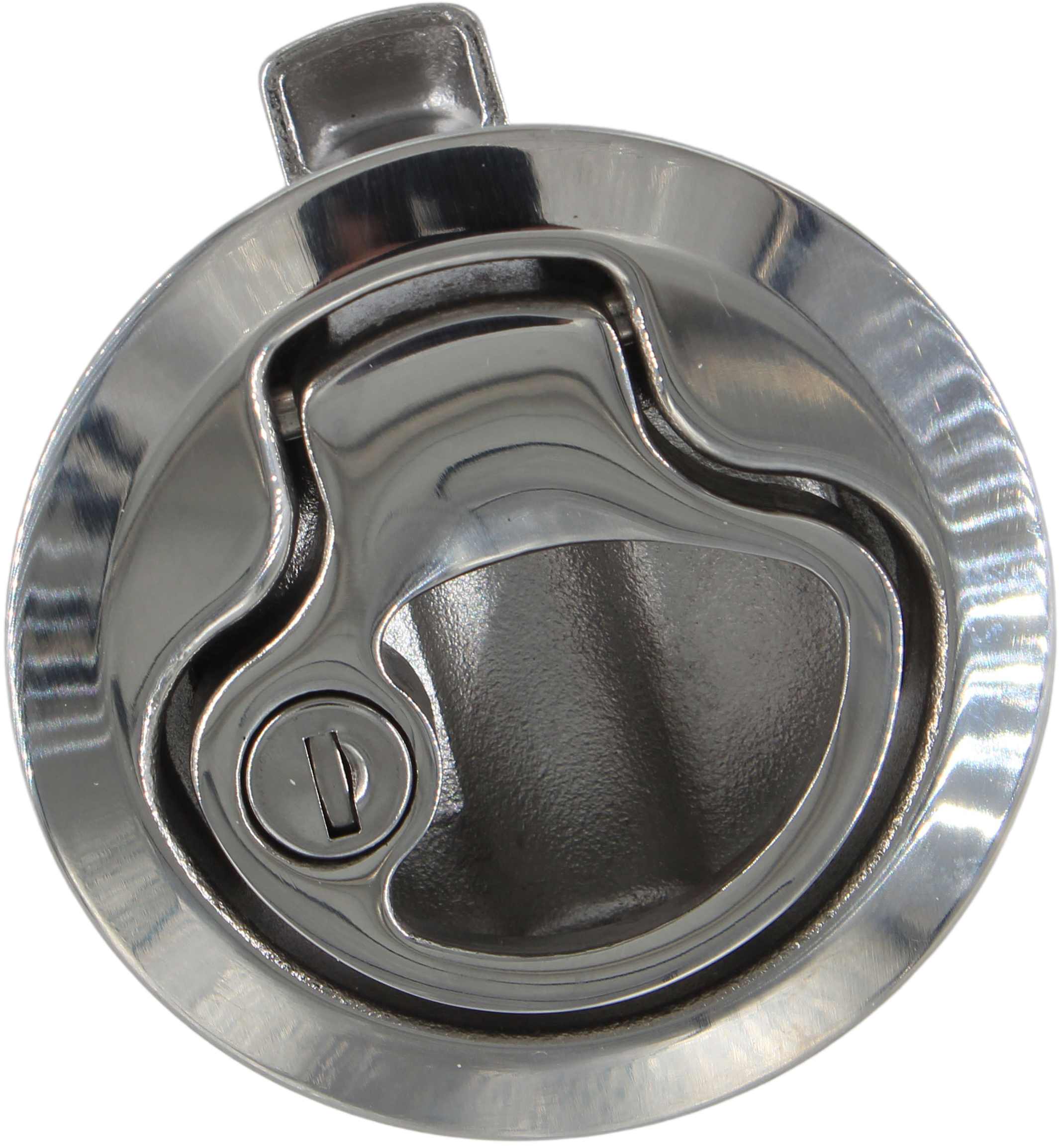 Lekker rund lukelås i blankpolert syrefast stål. Låsen er fjærbelastet, og lukker automatisk. Smart konstruksjon gjør den enkel å operere med kun én finger.