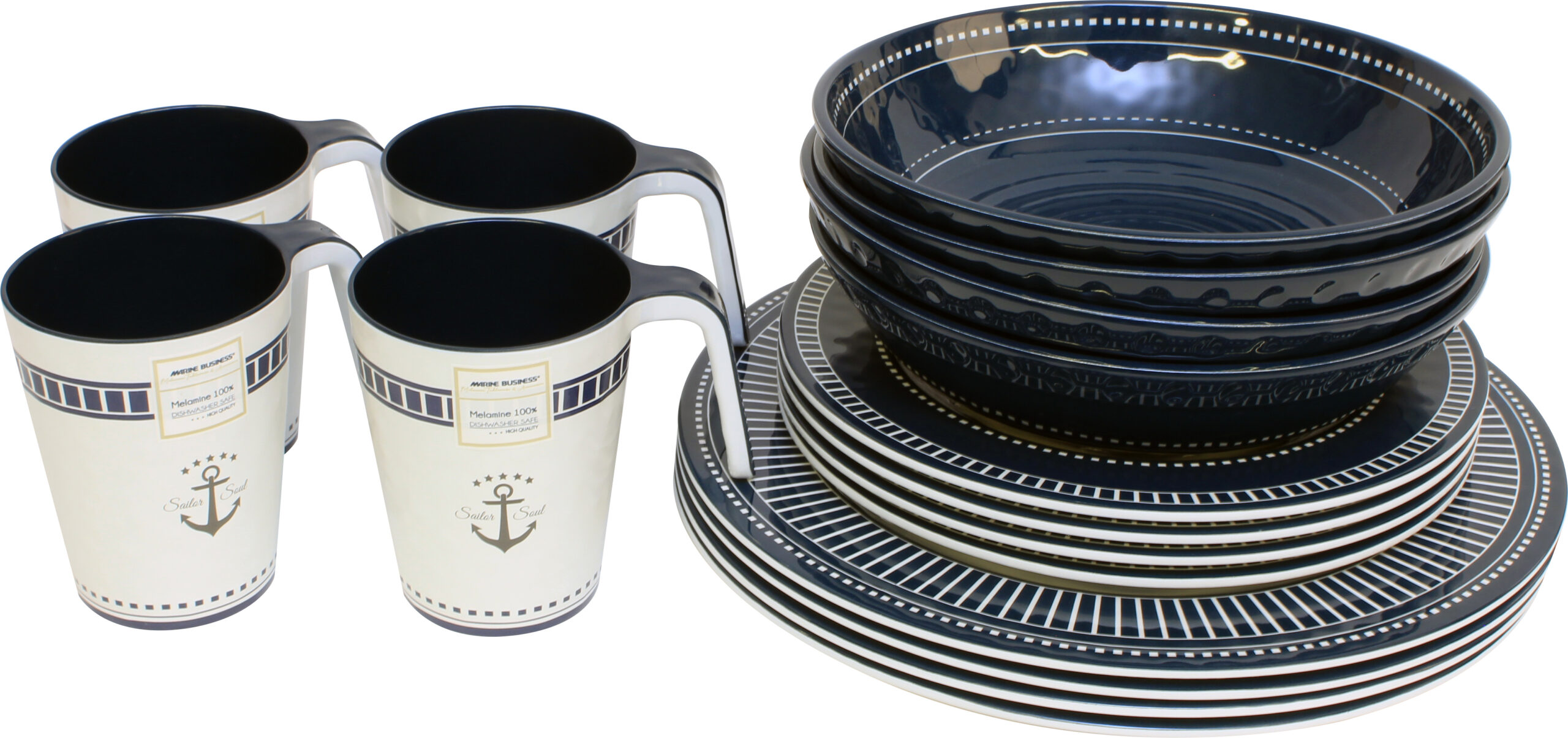 Bruddsikkert servise «Sailor Soul» i melamin og glass i høy kvalitet for fire personer, med et diskret preg og et eksklusivt nautisk design – elegant med karakter. Består av 16 deler + kurv.
