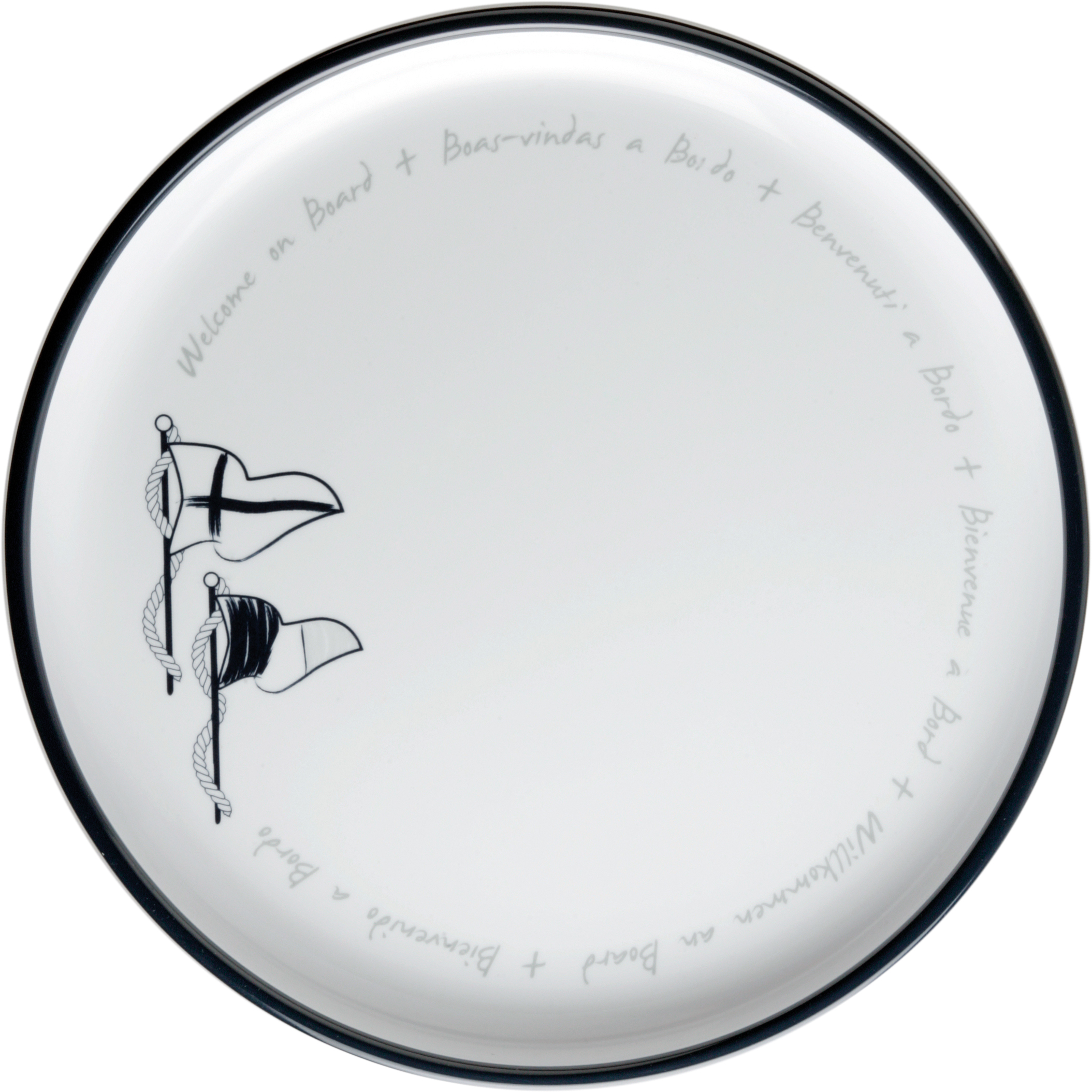 Melamin-middagstallerken er stor i størrelse og utgjør en del av det uknuselige melamin-serviset Welcome, som har sett med middagsplater, suppe og dessertplater laget av melamin, dekorert i nautisk stil.