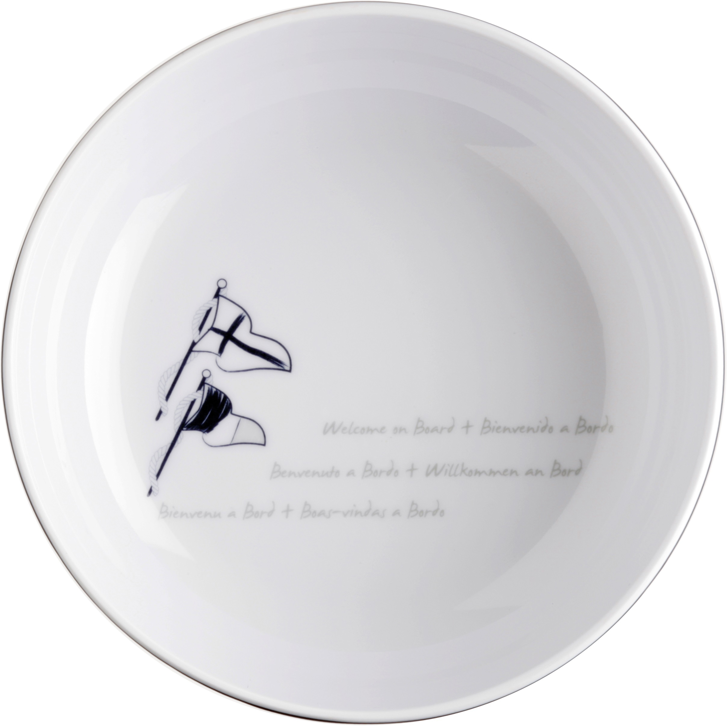 Skål Ø15 cm er en del av det uknuselige melamin-serviset Welcome, som har sett med middagsplater, suppe og dessertplater laget av melamin, dekorert i nautisk stil.